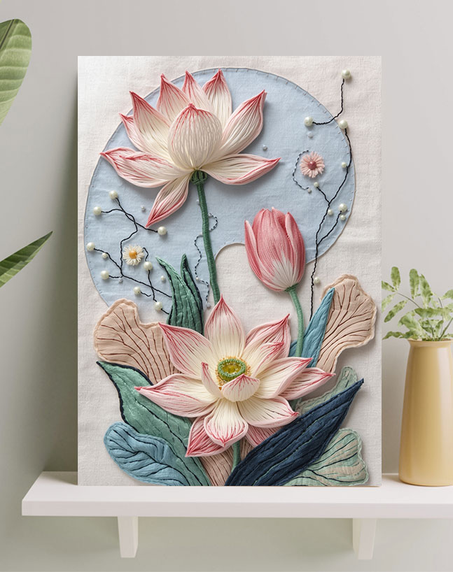 این تابلو حس نوستالژی هنر دستی را با سبک فانتزی ترکیب کرده و فضایی گرم و هنرمندانه ایجاد می‌کند. بافت و جزئیات مانند کار واقعی گلدوزی به نظر می‌رسند و انرژی آرامش‌بخشی به محیط می‌دهد. مناسب دکورهای صمیمی و فضایی که نیاز به لطافت دارد.